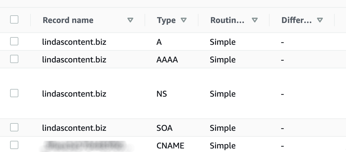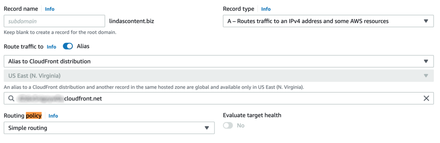 Your A and AAAA records should now have the “Alias” option turned on, which creates a dropdown that includes your CloudFront distribution, which should be selected in those two records.