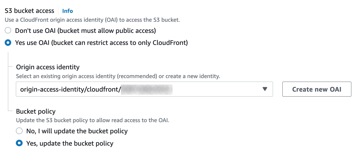 - If your bucket is not public, then you will need an “OAI” (Origin Access Identity), which is basically a user that can be added to the public policy. Letting CloudFront update the bucket policy will automatically add a block to the existing bucket policy to allow access from the OAI.