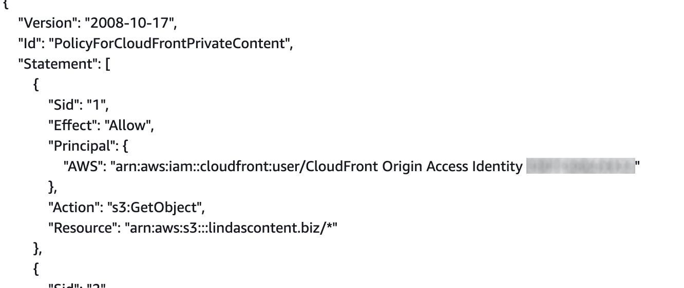 The OAI from the CloudFront distribution’s origin should match what’s in the S3 bucket policy (the blurred part)